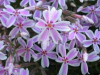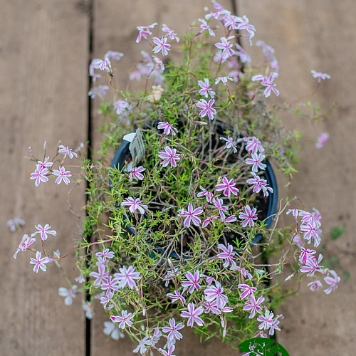 Флокс шиловидный: высота растения около 17 см. Образует вечнозеленые плотные коврики. Лежачие стебли с очень короткими междоузлиями сплошь покрыты сидящими мелкими, узкими, острыми и жесткими листьями до 2 см длиной. Стебли заканчиваются цветоносами, несущими один — два цветка каждый. Цветки диаметром около 25 мм, розовой, белой, пурпурной, лиловой окраски. Цветет с середины мая до конца первой декады июня, вторично и менее обильно в августе — сентябре.