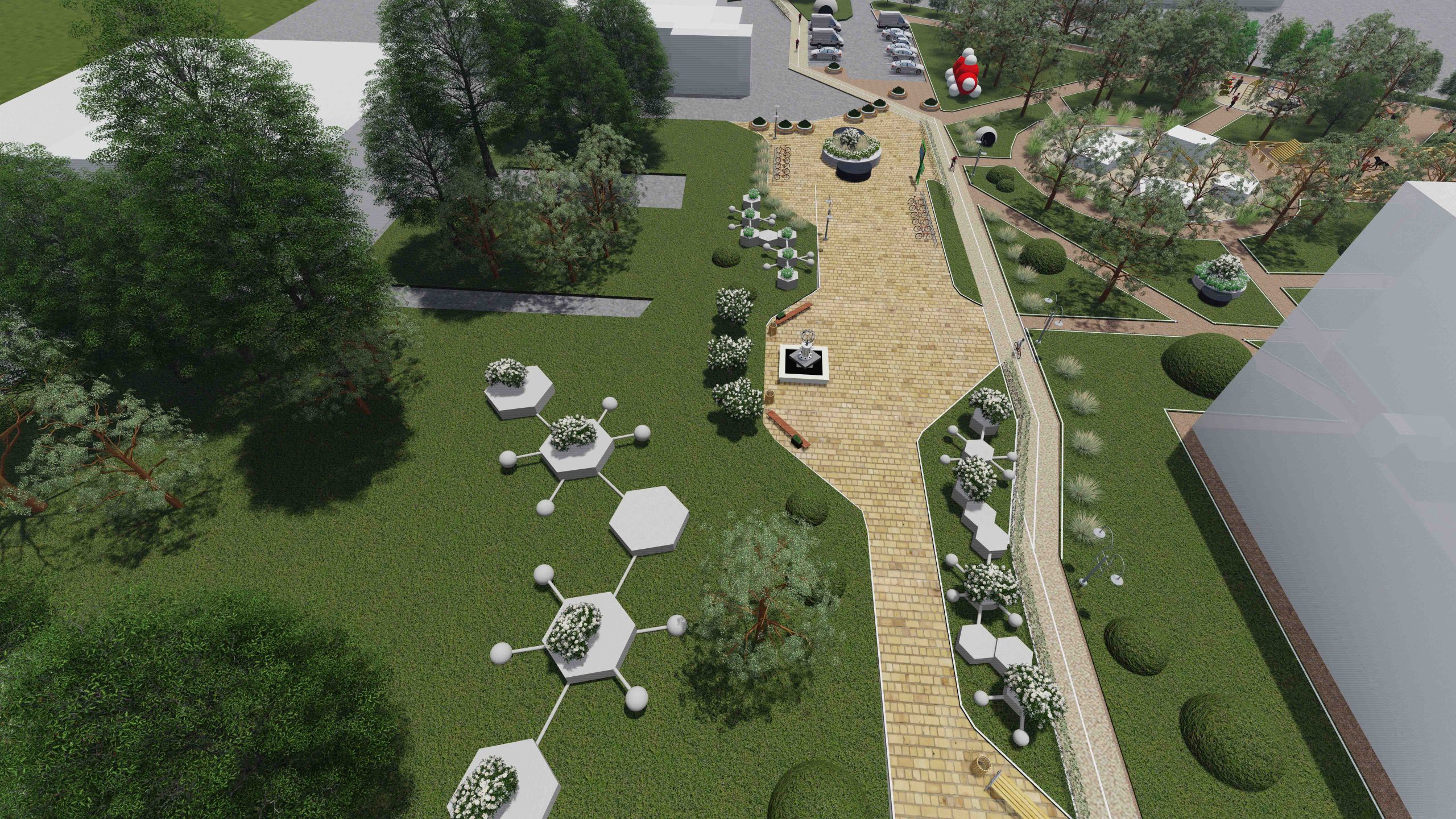 На территории создан ряд арт-объектов, которые позволяют изучать науку: молекулы, детский научный городок, столы с возможность проведения опытов, клумбы в виде различных химических соединений. Некоторые из объектов имеют продуманные неточности, что позволит анализировать и искать «ошибки».