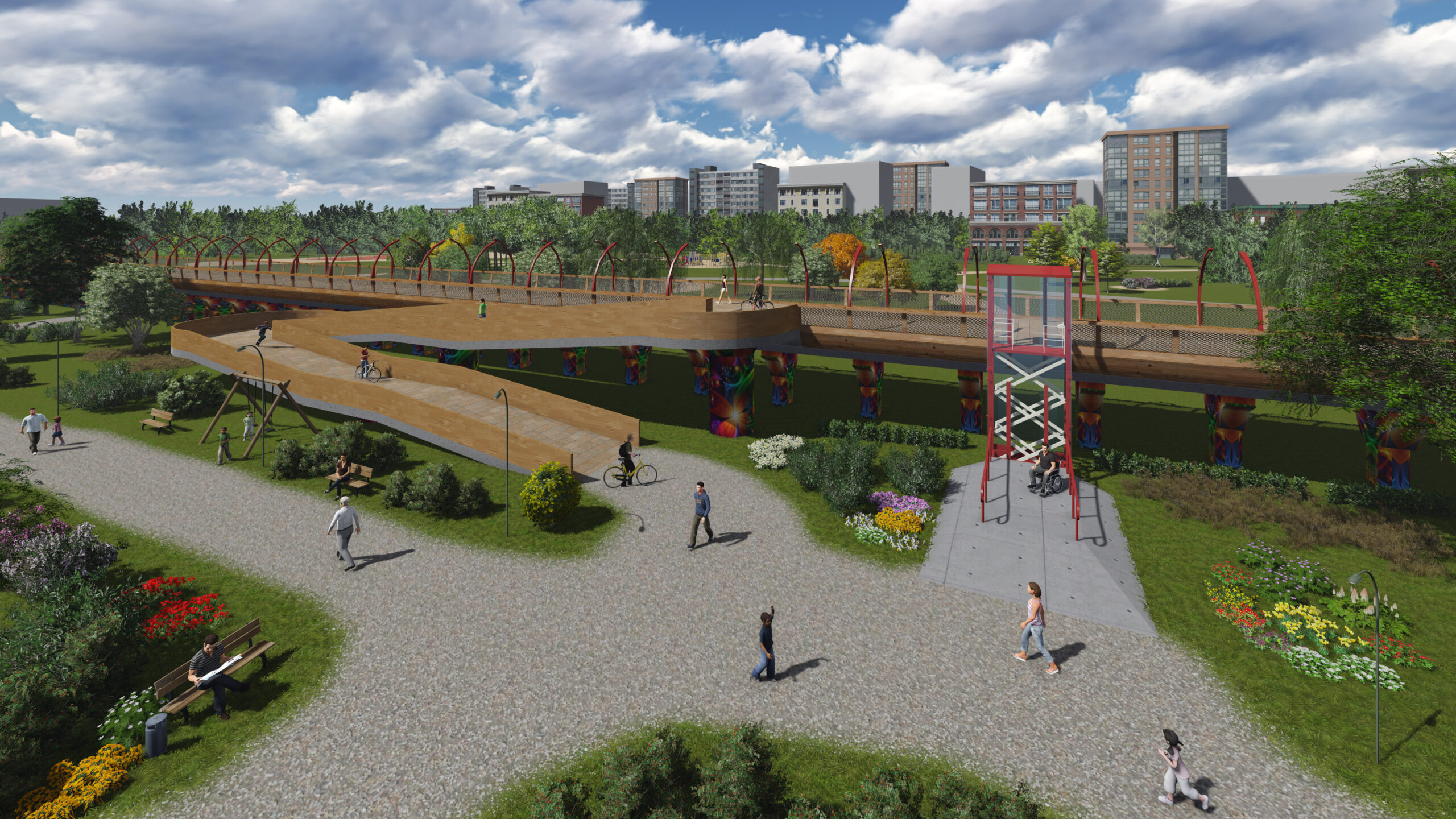 По аналогии с французским садом «Ла виллет» спланирована дорожка над парком. Дорожка замкнутая, по ней можно гулять в любое время года на высоте деревьев.
